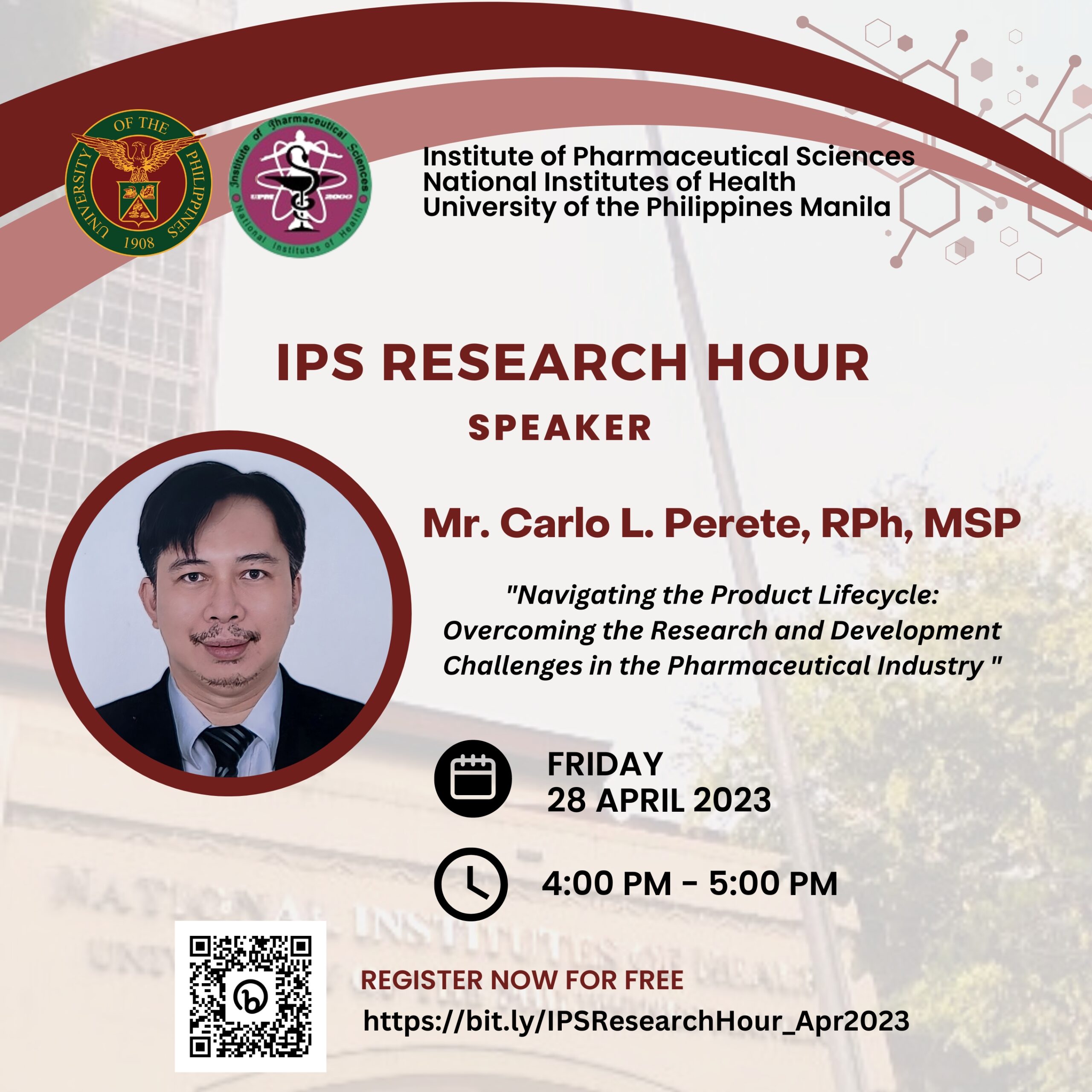 We suggest registering in advance. If there is any problem with this link, please contact the NIH-IPS secretariat email c/o Ms. Ana Rose Palmes: ips_nih.upm@up.edu.ph