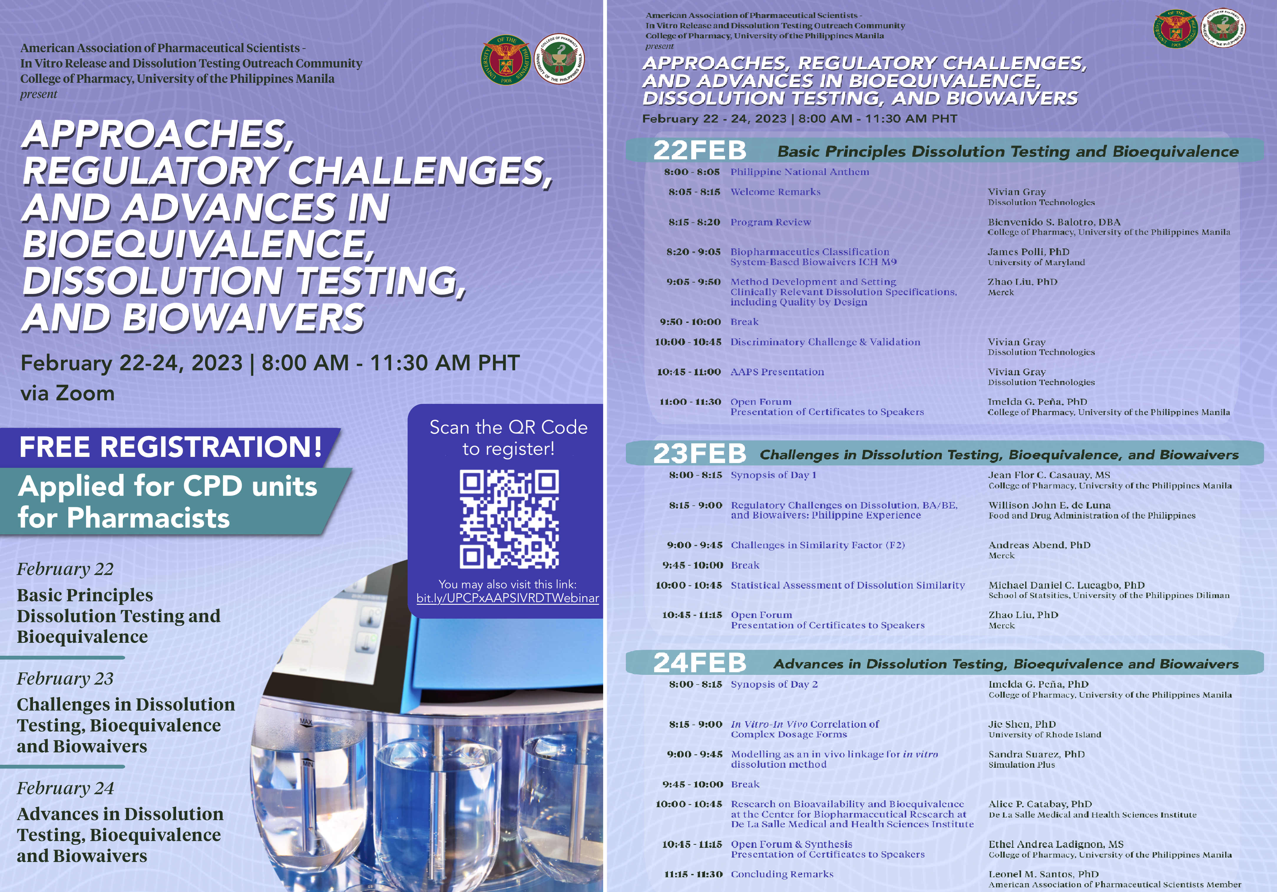 The UP College of Pharmacy invites you to a three-day webinar series co-hosted by the American Association of Pharmaceutical Scientists – In Vitro Release and Dissolution Testing (AAPS-IVRDT) Outreach Community, to be held on February 22, 23, and 24, 2023 via Zoom platform. Registration is free and with applied CPD units for pharmacists.