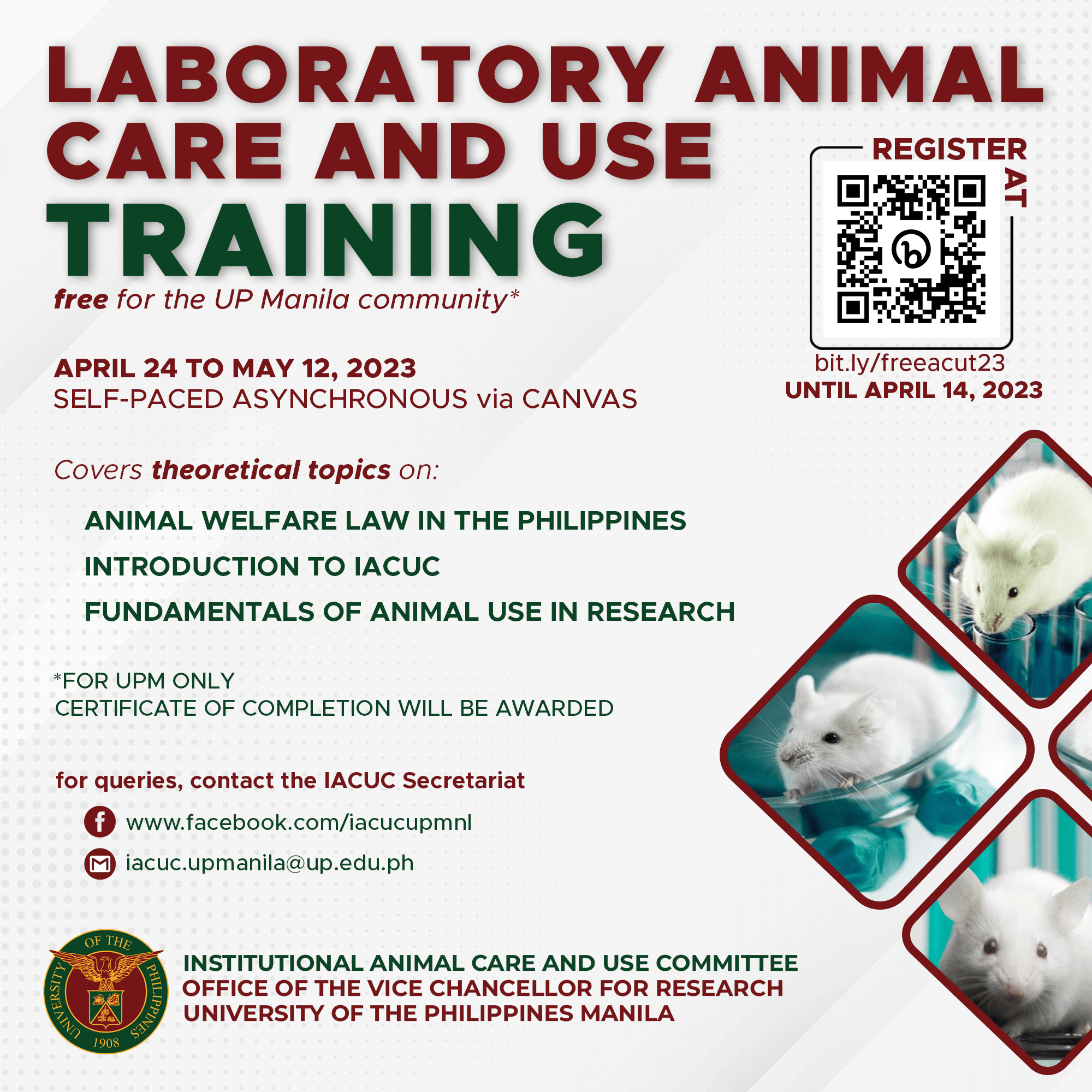 Organized by the UP Manila Institutional Animal Care and Use Committee, the Free Basic Laboratory Animal Care and Use Training is an asynchronous and self-paced online course that will be open from April 24 to May 12, 2023, for UP Manila faculty, students, and staff who are doing or practicing biomedical research in the academe, government, and private institution.